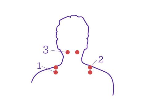Underneath the base of the skull, in the indentations about two to three inches apart.