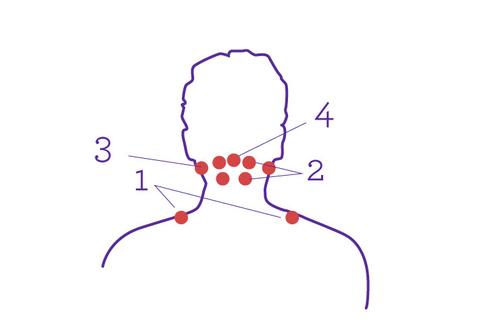 Ball of tension just above the shoulder blade midway between the base of the neck and the outside of the shoulders.